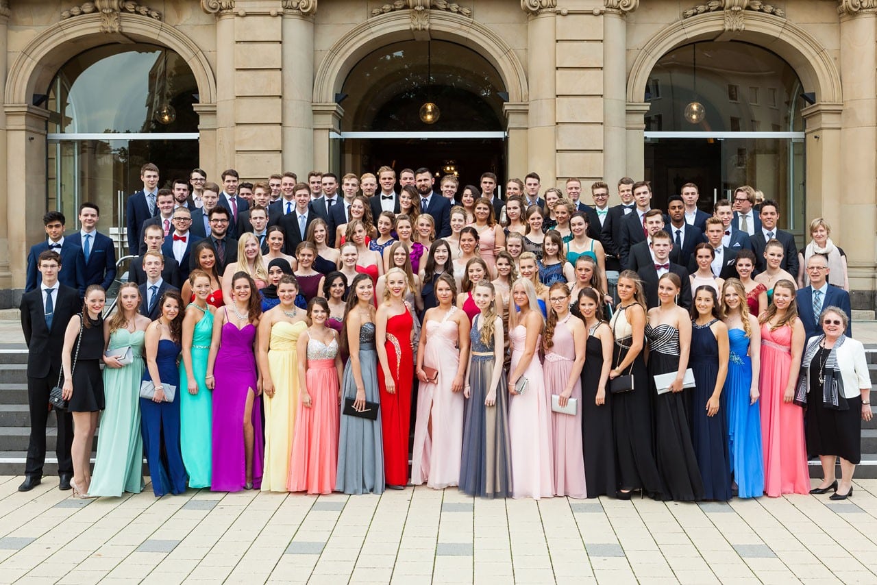 Sollte man keinen optimalen Platz erwischt haben kann man sich für das Foto auf die Zehenspitzen stellen. So kann man trotzdem noch sein Gesicht auf dem Foto sehen. Der Trick gilt nicht nur für kleinere Leute, sondern für alle die ansonsten nicht gut sichtbar sind. Bei 1-2 Reihen mit Menschen vor einem sieht man nicht, dass getrickst wird. Bei diesem Gruppenfoto in der historischen Stadthalle Wuppertal haben wir eine Bühne genutzt um zwei Ebenen zu erhalten.