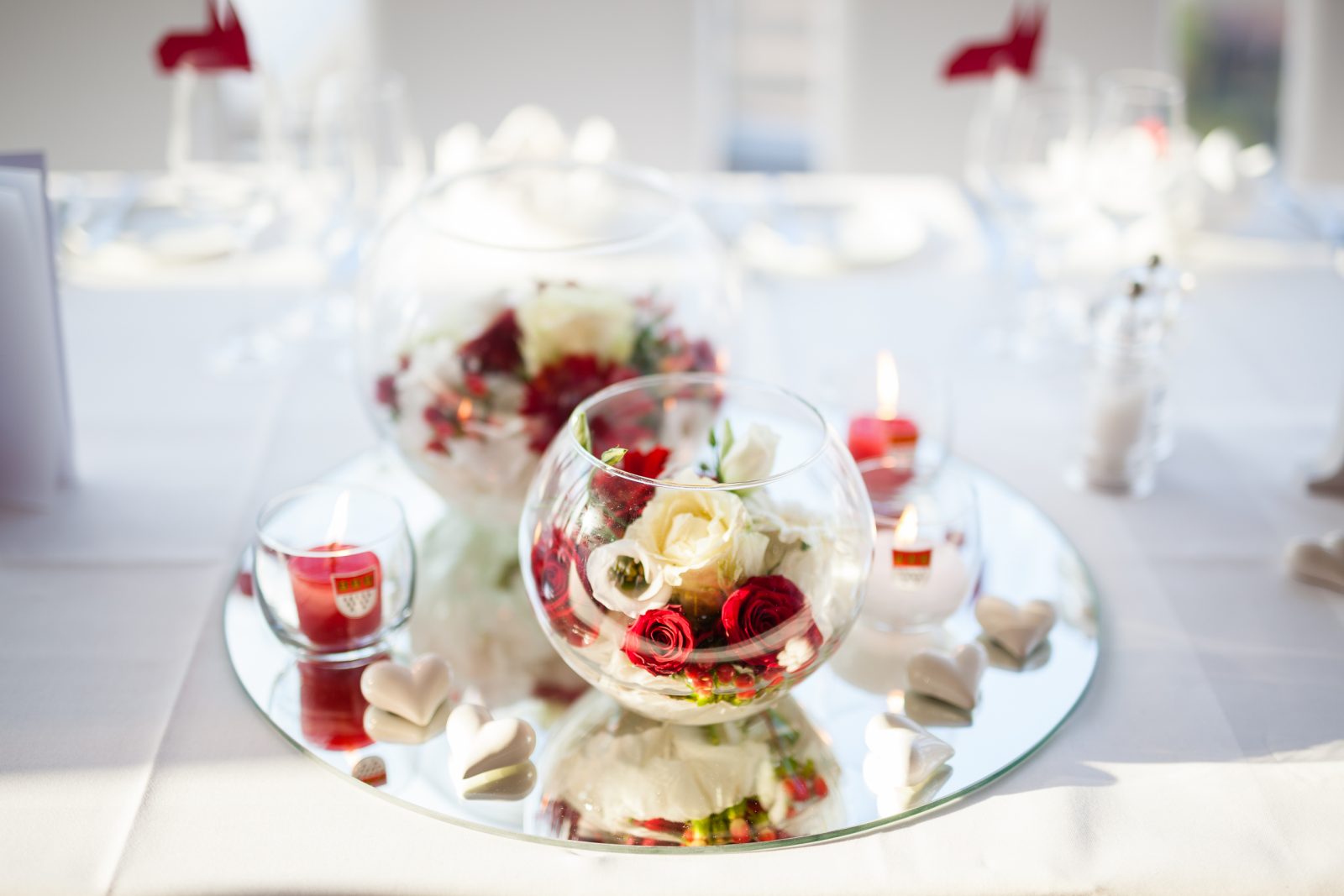 Die Dekoration war natürlich farblich abgestimmt und wurde von der Trauzeugin gemacht, die von Beruf Dekorateurin ist. Alles passte perfekt zusammen und wurde durch die rot gekleideten Gäste zu einem Kunstwerk. Nach einigen persönlichen und sehr emotionalen Ansprachen von Familienmitgliedern vom Brautpaar wurde die Vorspeise serviert und zum Hauptspeisen-Buffet geladen. Anschließend wurde die Hochzeitstorte angeschnitten, welche aus einer kleinen Torte und einem separaten Etagere mit Cupcakes bestand. Zusätzlich gab es ein kleines Nachspeisenbuffet.