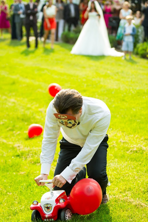 Zunächst baut ihr einen kleinen Parkour auf indem ihr die Luftballons gut befestigt. Am besten auf einer Wiese oder in einem großen Raum. Verbindet dann dem Bräutigam die Augen. Er muss nun zu Fuß versuchen, nur mit Hilfe der Richtungsanweisungen der Braut, die Ballons zu zerstechen. Besonders amüsant ist das Ballonstechen für die Zuschauer, wenn es mit einem lustigen Musikstück untermalt wird. Hier ist Spaß auf der Hochzeit vorprogrammiert! Für diese Art der Hochzeitsspiele benötigt man natürlich eine Hochzeitslocation mit einem großen Außenbereich.